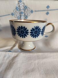 Questo tipo di porcellana è noto per il suo colore bianco puro e la sua composizione leggermente più delicata rispetto alla bone china. Al marchio viene aggiunta la scritta Echt Kobalt indica che la decorazione è realizzata con un pigmento blu cobalto. Misure tazza altezza cm 7, piattino cm 14,5 diametro e piatto più grande cm 19 diametro.