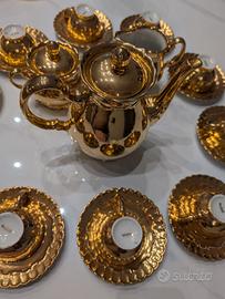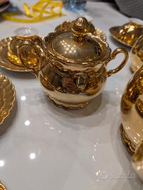 servizio da the bavaria in porcellana color oro. sono presenti 12 piattini, 10 tazzine, lattiera, 1 zuccheriera e 1 teiera. il servizio presenta imperfezioni dovute al tempo