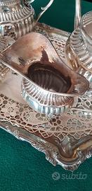 Splendido servizio da thè in peltro, esteticamente perfetto. Composto da 4 pezzi. Regalo vassoio, sempre di peltro. Consegna a mano in zona Lecco.
