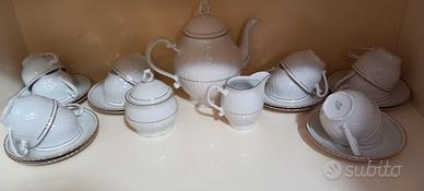 Servizio da thè da 12 mai usato, con teiera, zuccheriera, lattiera. Bianco con filo d'oro.