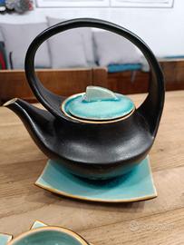Servizio da the in ceramica in stile giapponese composto da una teiera e 4 tazze con piattini quadrati abbinati.