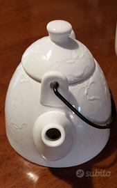 Teiera e 4 tazze senza manico marca Neavita ceramica bianca con rilievi floreali mai usata vendo con la propria scatola. Ritiro a Martellago 35 euro
