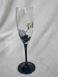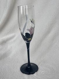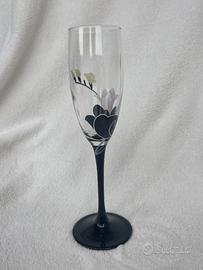 Elegante servizio composto da 11 bicchieri flute da champagne in vetro, prodotti in Francia da Luminarc. I bicchieri presentano un raffinato decoro floreale stilizzato nei toni del nero, rosa e giallo, con stelo e base in vetro color blu intenso che conferiscono un aspetto moderno e ricercato. Ideali per occasioni speciali, collezionismo o per arricchire una tavola vintage anni ‘80/‘90.