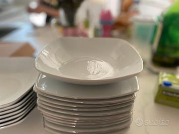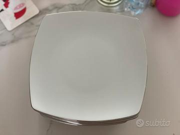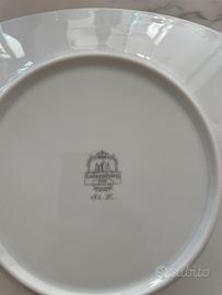 Servizio di piatti in fine porcellana Luisemurg. Bianchi con bordo argento. Formato da: 12 piatti piani; 8 piatti fondi; 12 piattini da frutta; 1 piatto piano grande 2 vassoi; 1 zuppiera; 1 risottiera;