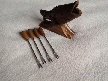 4 forchettine da antipasto, manico e contenitore in legno