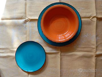 Vendo set da 18 pezzi, sei fondi (color arancio) sei piatti e sei piattini (color acquamarina), marca "Saude por Evviva" in gres con spirali dipinte a mano. Mai utilizzati e in perfette condizioni. Non ho la confezione originale ma è assolutamente nuovo.