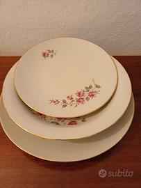 come da foto, vendo servizio completo di piatti Bavaria vintage in porcellana, caratterizzato da un delicato motivo floreale a rose rosa e un sottile bordo dorato.