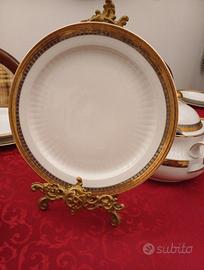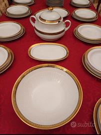 Servizio piatti in finissima porcellana bavaria winterling marktleuthen, con bordo in oro zecchino, non e' mai stato usato solo esposizione in vetrina ( nuovo) si segnala causa due traslochi nonostante le dovute precauzioni, purtroppo due piatti uno fondo e uno piano presentano una lieve sbeccatura lateralmente ( vedi foto nel cerchio giallo ) tutto il resto perfettamente conservato, per allestire con stile la tavola di Natale o per qualsiasi altro evento, cedo per inutilizzo