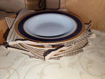Design raffinato: ceramica bianca con bordo blu intenso e decorazioni dorate in stile greco, perfetti per una tavola elegante o per collezionisti.