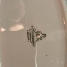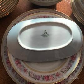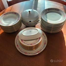 servizio di piatti per 12 coperti in porcellana prodotto dalla azienda tedesca hutschenreuther esperta nelle porcellane questo articolo è stato prodotto negli anni 70/80 forse anche prima la bordatura di tutto il servizio è rifinita in oro ( manca solo 1 piatto fondo il resto sono tutti 12 per tipo più piaitto grande per salumi e zuppiera e per finire un piattino per alici/ acciughe ecc