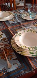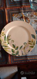 Vendo raffinato servizio di piatti in ceramica decorata, impreziosito da un delicato motivo botanico con foglie verdi su fondo avorio.