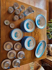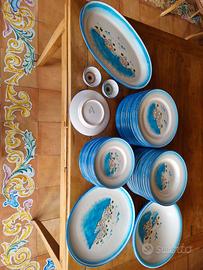 Servizio di piatti in ceramica di Vietri dipinti a mano, composto da: 12 piatti piani, 12 fondi, 12 da dolce, 1 teiera/caffettiera, 6 tazze da tè con piattino, 1 brocca, 6 bicchieri, 2 piccole ciotoline, un piatto grande tondo, un piatto ovale e una coppa da portata. NON si effettuano spedizioni.