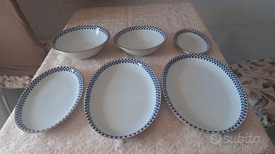 Servizio di piatti in finissima porcellana bianca con rigo oro e blu composto da : n. 12 piatti piani da cm. 23,5 + altri 13 di riserva