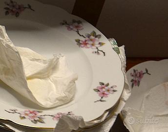 Servizio completo di Piatti per 6 persone in porcellana Bavaria Seltmann Weiden, con delicato disegno in fiore di ciliegio. Composto da: 6 piatti piani, 6 fondi, 6 piccoli da dolce, 1 vassoio tondo (e 1 ovale) grande e 1 (+1 ovale) piccolo, 1 insalatiera, 1 salsiera.
