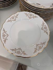 Servizio da tavola in porcellana Richard Ginori con decoro classico beige/oro e bordo dorato.