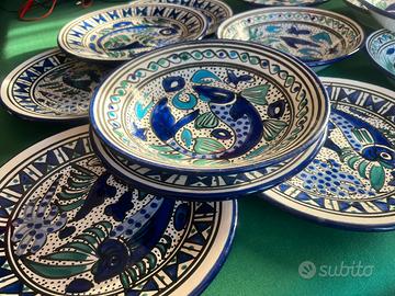 Vendo sevizio di piatti in ceramica per 6, formato da sei piani e sei fondi, con motivo ittico, di conseguenza adatto per pesce, nuovo e mai usato, di fattura tunisina.