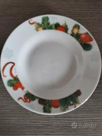Servizio di Piatti Natalizio composto da 6 piatti fondi e 6 piatti piani con decorazioni ai bordi di ghirlande pigne stelle. Nuovo in confezione originale. Mai usato.