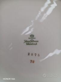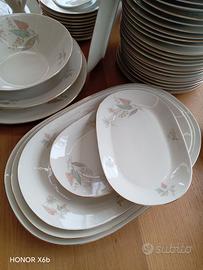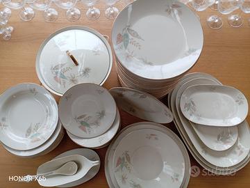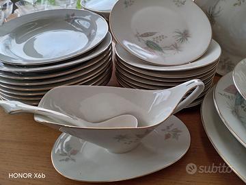 Vendo servizio di piatti porcella Bavaria Johann Seltmann Vohenstrauss, numerati, con motivo floreale e finiture in oro. Anni 60, servizio da 10. Comprendente 20 piatti fondi, 30 piani, 10 piattini, 1 zuppiera, 1 salsiera con cucchiaio, 2 piatti tondi da portata, 1 insalatiera, 3 piatti ovali grandi da portata e 2 piatti ovali piccoli da portata. Mantenuti in modo splendido nessuna ceramica rovinata o sbeccata.