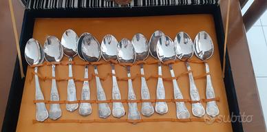 Vendo servizio di posate vintage, lama super inox con punzone ARG 800, prodotto fatto in Italia da ripulire, composto da 51 pezzi, 12 coltelli, 12 cucchiaini, 12 cucchiai, 12 forchette, 1 mestolo, 1 forchettone e 1 cucchiaio grande. N.B. Sebbene le posate sono marcate ARG 800 per non creare false illusioni non si tratta di argento massiccio