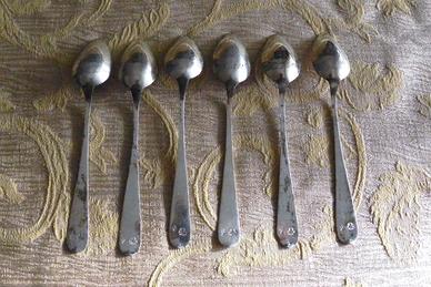 Servizio di sei cucchiaini d'argento risalenti a fine Ottocento o ai primi decenni del Novecento con doppio punzone, in ottimo stato di conservazione, con patina del tempo e normale ossidazione del metallo.