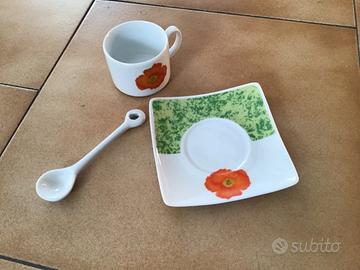 Vendo servizio di 6 tazzine da caffè Passione Casa Porcelain con piattino quadrato e cucchiaino in ceramica, bianche con decoro fiore arancione. Diametro tazzina 6 cm, altezza 5 cm, lato piatto 10,5 cm.