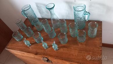 servizio di vetro da tavola design , color verde e vetro martellato ,composto da 6 bicchieri acqua , 6 di vino , 2 brocche acqua e 1 di vino e 3 brocche piccole , perfetto mai usato ,