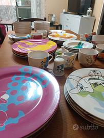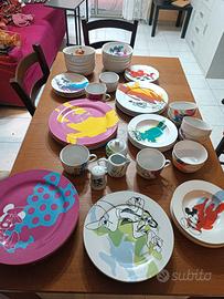 il servizio comprende 8 sottopiatti 8 piatti piani 8 piatti fondi 8 piatti frutta 8 ciotole (una leggermente sbeccata) 8 ciotoline (una leggermente sbeccata) 4 tazze 1 bricco da latte 1 zuccheriera