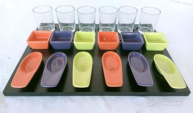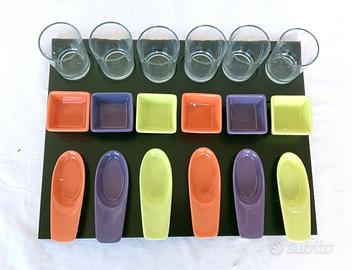 Servizio per finger food. Prodotto a Villeneuve-d’Ascq. Con terrine in ceramica e bicchierini in vetro. Misure del vassoio 35x27 cm. In confezione di cartone originale. Possibilità di spedizione e di consegna a Gaggiano e limitrofi. Il ricavato verrà devoluto a scopo benefico.