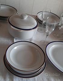 Vendo servizio piatti Ginori da 12 con riga blu e oro. Con 12 piatti piani, 12 piatti fondi, 12 piatti da dessert. Zuppiera con coperchio, insalatiera, un piatto tondo e un piatto ovale da portata. Il servizio è in condizioni perfette mai usato. Ogni pezzo è numerato Prezzo 450 euro Roma. NON spedisco