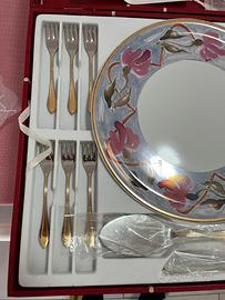 Servizio da dolce Gottinghen con piatto dipinto a mano, posate laminate in oro 24k. Nuovo, mai usato.