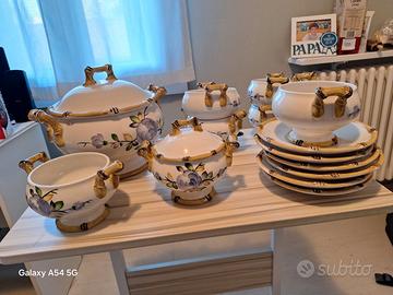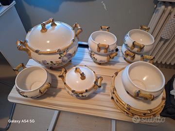 Antico e raro servizio per zuppe in ceramica lavorata a mano, completo di terrina e 7 ciottole di consumazione comprese di piattino, di cui 2 complete di coperche adatto sia per uso culinario che per collezioneio. Bellissimo!