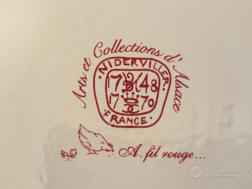 Servizio in ceramica alsaziana composto da due tazze devorate e una brocca. Niderviller collezione Fil rouge.