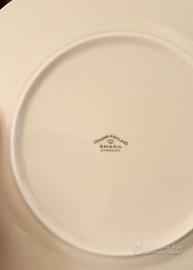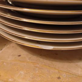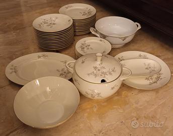 Vendo elegante servizio da 42 pezzi in porcellana fine bordata in oro, completo per 12 persone, composto da: • 12 piatti da dessert • 12 piatti fondi • 12 piatti piani (di cui uno con una piccola sbeccatura, come in foto) • 1 zuppiera con coperchio • 1 insalatiera • 1 ciotola grande • 1 raviera (piatto ovale) • 1 piatto da portata • 1 piatto da antipasti Tutto in ottime condizioni. Consegna a mano, no spedizione