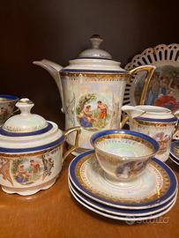 Servizio da tè / caffè vintage in porcellana iridescente, decorato con scene mitologiche e classiche di ispirazione greco-romana.