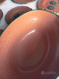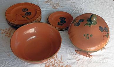 Vendo, incompleto, SERVIZIO IN TERRACOTTA in foto, costituito da zuppiera con coperchio (lung.cm 31,5 con manici, larg.cm 20, alt.cm 11), insalatiera (diam. cm 25,5, alt.cm 11), 6 piatti da secondo (diam. cm 23), 4 piatti da dolce o frutta (diam. cm 18). Leggeri segni del tempo. Spedizione costo 15 euro.