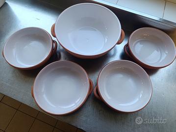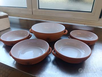 Vendo servizio in terracotta smaltata, ideale per la cottura lenta dei cibi, marca "I COTTI DELL' ACCADEMIA", composto da 5 pezzi: 4 ciotole diametro 18 cm 1 zuppiera con manici diametro 24 cm Nuovo, mai utilizzato, nella propria confezione originale.
