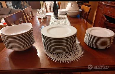 12 piatti piani, 12 scodelle, 12 piatti antipasto, zuppiera, insalatiera, piatto piano, servizio da caffè da 12 completo di caffettiera, vassoio, bricco latte e servizio da tè da 6 completo di vassoio e teiera.