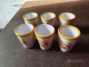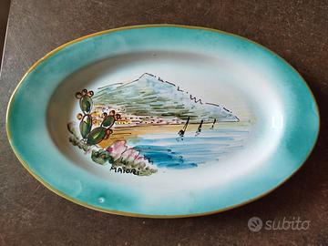 Servizio da 6 in ceramica Maiori.piatto ovale da portata decorato e 6 bicchierini. Condizioni ottime, esclusivamente una piccola scheggiatura sul retro del piatto , come da foto.