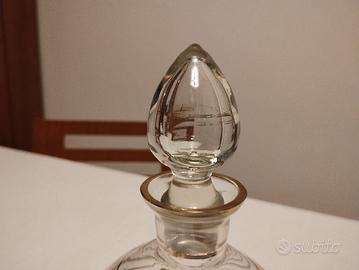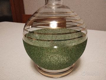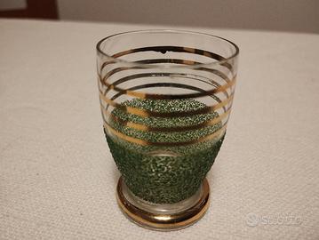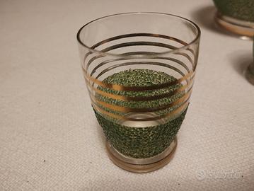 Delizioso servizio in vetro con bottiglietta e 4 bicchierini. Decorato in verde e oro. Anni '50. Non spedisco vista la fragilita degli oggetti
