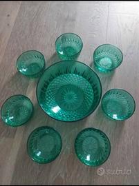 Servizio Macedonia. Ciotola + 7 coppette in vetro verde lavorato. Vintage fine anni 70. Ciotola diam.20 x h.10 Coppetta diam.10 x h.5