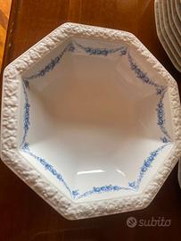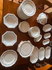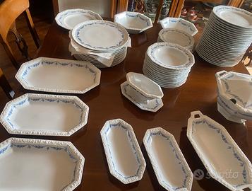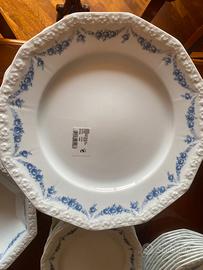 Servizio completo da 12 in porcellana Rosenthal. Serie Maria Rosenkante con roselline blu completo: 12 piatti fondi. 12 piatti piani.12 piatti frutta.12 sottopiatti grandi.1 zuppiera grande.1porta salsine.3 pirofile grandi.1 pirofila media.2 pirofile picoole. 2 piatti insalatiera grandi.1 piatto grande da portata. Servizio mai usato. Vedi foto.