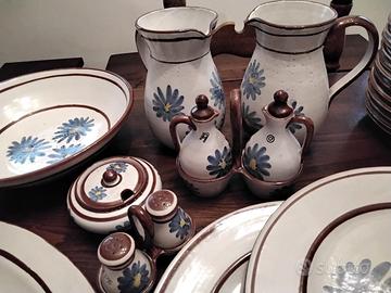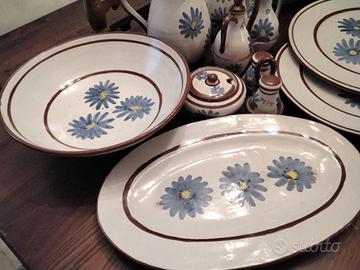 Splendido servizio di piatti per 12 persone costituito da - 11 piatti piani (purtroppo 1 manca) - 12 piatti fondi - 12 piattini da contorno o dessert - 2 caraffe per acqua e vino - 2 piatti da portata tondi - 1 piatto da portata ovale - 1 insalatiera grande - 1 set per olio e aceto - 1 set per sale e pepe - 1 formaggiera con coperchio Terracotta/ceramica dipinta a mano con decorazione floreale (luminosa e piacevole), prodotta a Vietri (Salerno) a metà degli anni '70 e marchiata " Rok Vietri". Dopo oltre 50 anni è introvabile così completo e in ottimo stato di conservazione (solo qualche lieve sbeccatura su pochi pezzi, assolutamente nessuna crepa o fessurazione). Per fragilità e peso, NON SPEDISCO Visione e ritiro a Oderzo (TV) previo accordi al 347.7412305. Guardate gli altri miei numerosi annunci. Grazie.