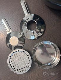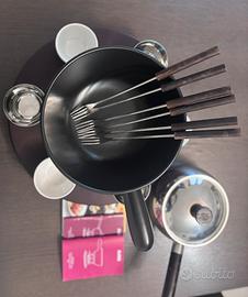 Set completo incluso due padelle( 1 in acciaio, 1 in terracotta) piatto per collocare le 6 ciotoline (3 in acciiao e 3 in ceramica) utili per contenere le diverse salse. Sei forchette con manico in legno. Mai utilizzato anche se bellissimo.