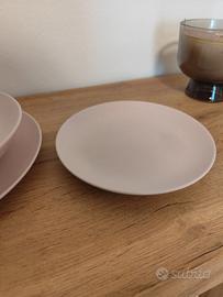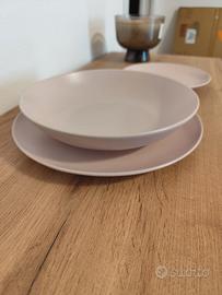 Servizio di 18 pezzi colore rosa chiaro opaco in gres lavabile in lavastoviglie e utilizzabile in microonde. Set composto da: 6 piatti da 26 cm, 6 piatti fondi da 23 cm, 6 piatti da frutta da 20cm. Mai utilizzati. No Sprovvisto di confezione originale. Non spedisco solo ritiro a mano.
