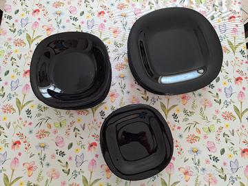 Vendo servizio piatti per 12 persone Luminarc serie Carine. I piatti sono in vetro temperato, colore nero lucido e di una particolare forma, rotonda fuori e squadrata dentro.