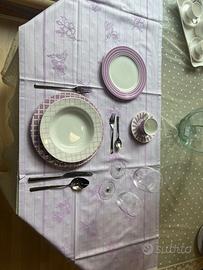 Servizio da tavola per 6 persone (19 pezzi) in porcellana bianca e lilla a marchio Andrea Fontebasso 1760. Il set si distingue per un design moderno "mix & match" con decori geometrici coordinati: presenta elementi con motivo a righe concentriche ed elementi con motivo a quadri (stile tartan) sulla falda. Il lotto comprende il posto tavola completo per 6 coperti e una insalatiera da portata.