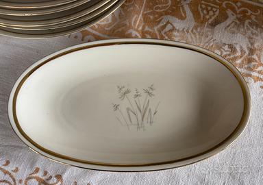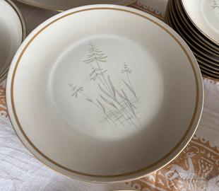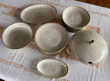 In condizioni ottime servizio piatti vintage originale anni 60, marca Seltmann Weiden Bavaria, con profilo in filo d’oro e delicato disegno. Servizio composto da: 1 zuppiera 2 piatti da portata 1 insalatiera 12 fondine 11 piatti Ritiro a carico dell’acquirente, zona Parma, non spedisco