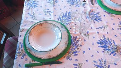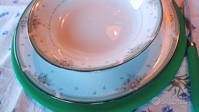 Servizio in originale composto da 12 pezzi di 3 tipologie di piatti (piano, fondo, e dolce o frutta) e da 3 tipologie di calici (acqua, vino, spumante). Ora manca qualche pezzo. Usato poco, ben conservato. Consegna solo a mano.