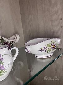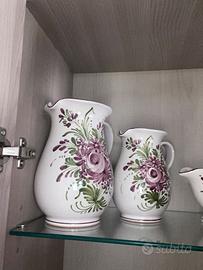 Servizio piatti ceramiche di Castelli dipinti a mano, composta da 12 coperti completo di zuppiera, brocca dell’acqua e brocca del vino, porta parmigiano, zuccheriera, porta peperoncino, brocca olio e aceto, tazzine con vassoio, due pirofile tonde per insalata o pasta , tre vassoi di diverse misure