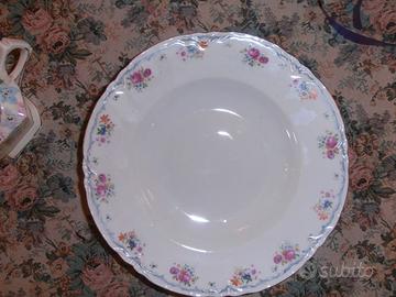 SERVIZIO PIATTI COMPLETO A FIORI CON BORDO DI ORO. NUOVISSIMO ANNI 60. VEDI FOTO. IL SERVIZIO E' COMPOSTO DA: 36 PIATTI PIANI 11 PIATTI DA FRUTTA 12 PIATTI FONDI 6 TAZZE GRANDI DA CAFFE' CON PIATTINO 1 PIATTO DA TAVOLA PER DOLCI 1 COPPA GRANDE PER ZUCCHERO 1 ZUPPIERA PER BRODO 1 VASSOIO ROTONDO DA PORTATA 1 CIOTOLA QUADRATA DA PORTATA 2 ALZATE 1 CIOTOLA PER SALSA CON CUCCHIAIO